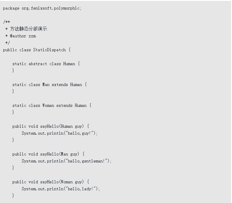 在开始讲解静态分派[插图]前,笔者先声明一点,“分派”(Dispatch)这个词本身就具有动态性,一般不应用在静态语境之中,这部分原本在英文原版的《Java虚拟机规范》和《Java语言规范》里的说法都是“MethodOverload Resolution”,即应该归入8.2节的“解析”里去讲解,但部分其他外文资料和国内翻译的许多中文资料都将这种行为称为“静态分派”,所以笔者在此特别说明一下,以免读者阅读英文资料时遇到这两种说法产生疑惑。