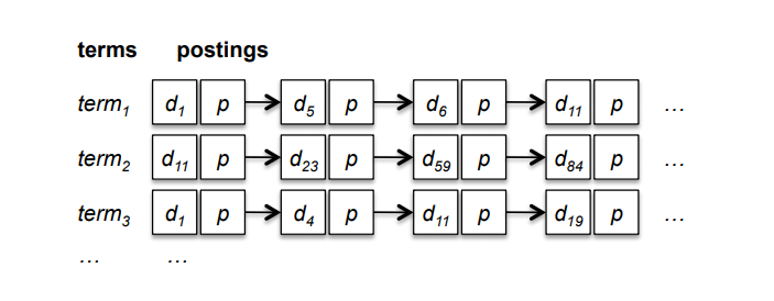 我们可以用一个HashMap来简单描述这个结构:Map<String, List<Integer>>,这个Map的Key的即是Term,那它的Value即是Postings。