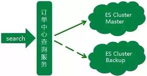 到此,订单中心的 ES 集群已经初具规模,但由于订单中心业务时效性要求高,对 ES 查询稳定性要求也高,如果集群中有节点发生异常,查询服务会受到影响,从而影响到整个订单生产流程。很明显这种异常情况是致命的,所以为了应对这种情况,我们初步设想是增加一个备用集群,当主集群发生异常时,可以实时的将查询流量降级到备用集群。