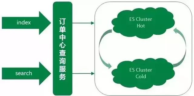 考虑到 ES 集群暂时没有很好的主备方案,同时为了更好地控制 ES 数据写入,我们采用业务双写的方式来搭设主备集群。每次业务操作需要写入 ES 数据时,同步写入主集群数据,然后异步写入备集群数据。同时由于大部分 ES 查询的流量都来源于近几天的订单,且订单中心数据库数据已有一套归档机制,将指定天数之前已经关闭的订单转移到历史订单库。