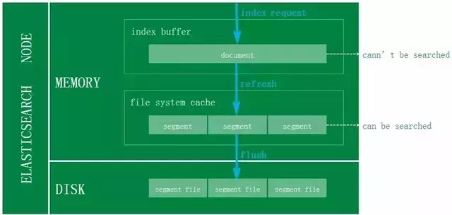 然而默认情况文档从 Indexing Buffer 到文件系统缓存(即 Refresh 操作)是每秒分片自动刷新,所以这就是我们说 ES 是近实时搜索而非实时的原因:文档的变化并不是立即对搜索可见,但会在一秒之内变为可见。