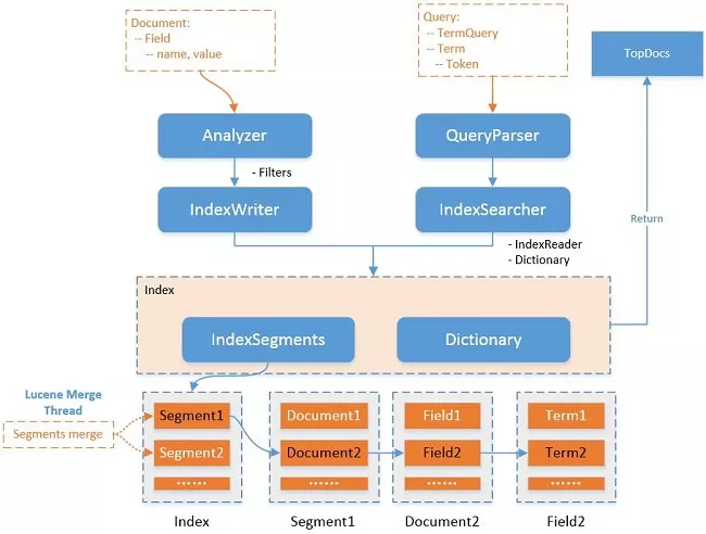 在Lucene中,分为索引(录入)与检索(查询)两部分,索引部分包含 分词器、过滤器、字符映射器等,检索部分包含 查询解析器 等。