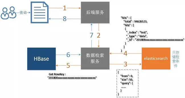 ES仅提供字段的检索,仅存储HBase的Rowkey不存储实际数据。
