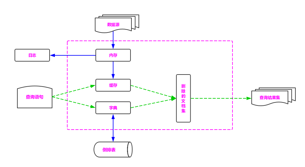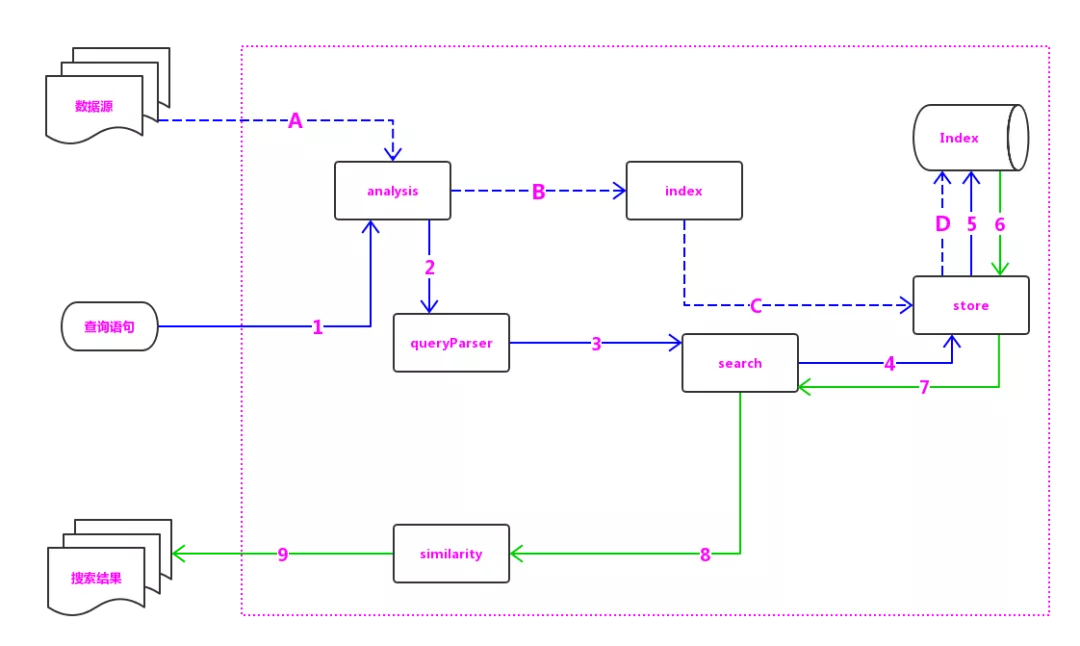 其中,虚线箭头(a、b、c、d)表示写索引的主要过程,实线箭头(1-9)表示查询的主要过程。