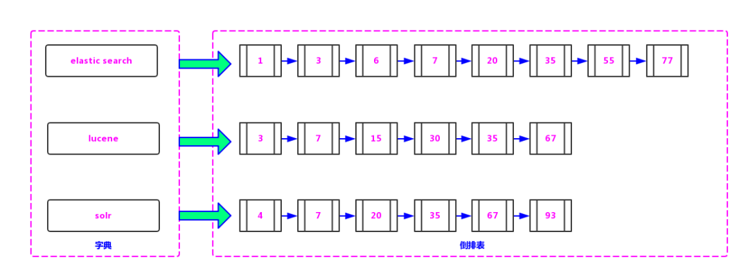 在倒排表中,“Lucene”指向有序链表 3,7,15,30,35,67,表示字符串“Lucene”在文档编号为3、7、15、30、35、67的文章中出现过,Elasticsearch 和 Solr 同理。