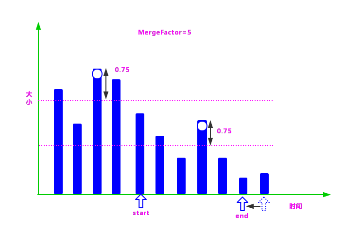②在数组中找到最大的段,然后生成一个由最大段的标准化值作为上限,减去 LEVEL_LOG_SPAN(默认值为 0.75)后的值作为下限的区间,小于等于上限并且大于下限的段,都被认为是属于同一组的段,可以合并。