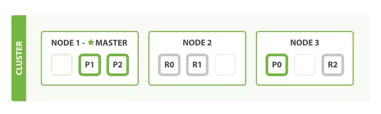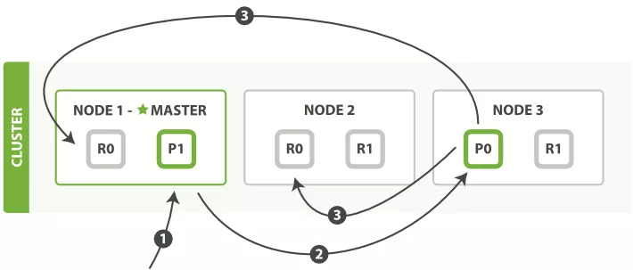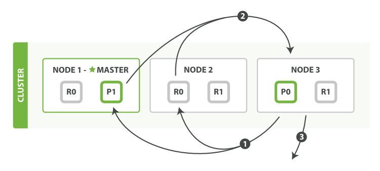 其中,标星号的 Node 1 是 Master 节点,负责管理整个集群的状态;p1 和 p2 是主分片;r0 和 r1 是副本分片。为了达到高可用,Master 节点避免将主分片和副本放在同一个节点。