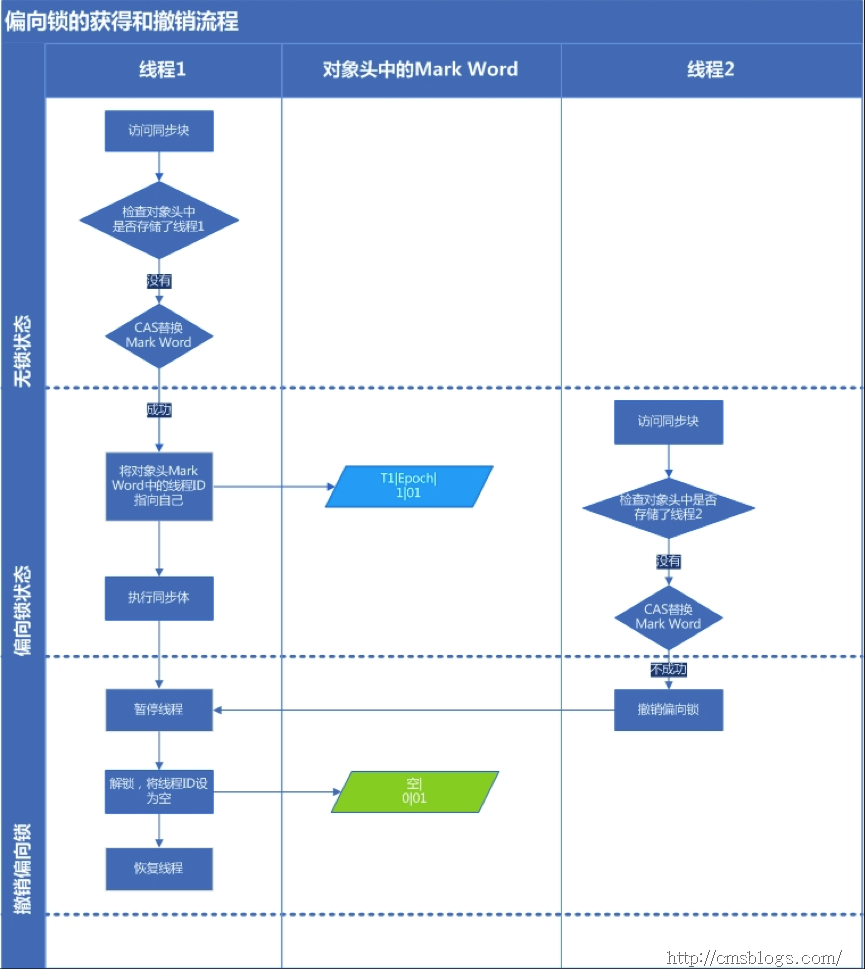 只需要检查是否为偏向锁、锁标识为以及ThreadID即可,处理流程如下: