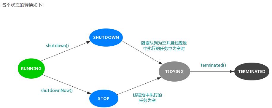 线程池同样有五种状态:Running, SHUTDOWN, STOP, TIDYING, TERMINATED。