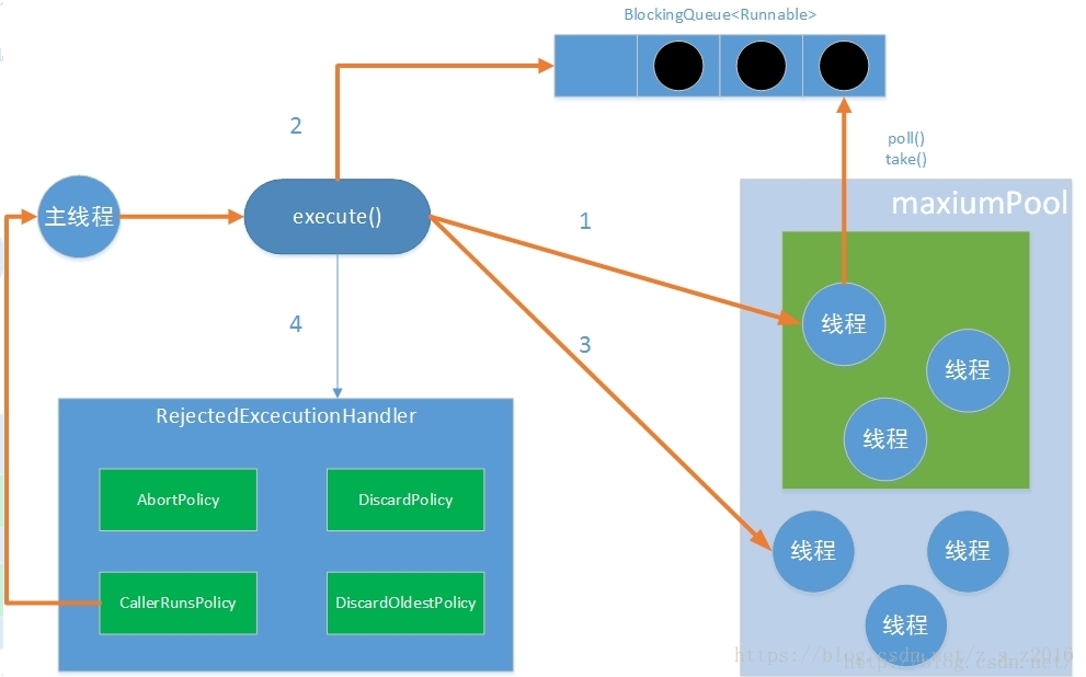 当阻塞队列也满了之后,则线程池会新建线程执行任务直到maximumPoolSize。