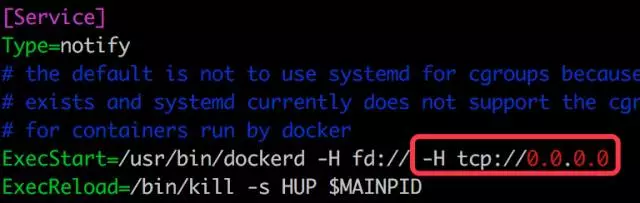 在环境变量 ExecStart 后面添加 -H tcp://0.0.0.0,允许来自任意 IP 的客户端连接。