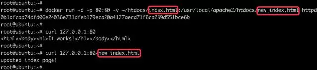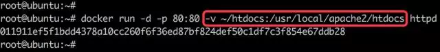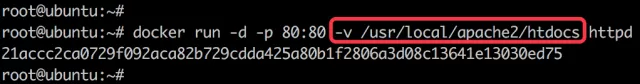 -v 的格式为 <host path>:<container path>。/usr/local/apache2/htdocs 就是 apache server 存放静态文件的地方。