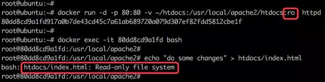 ro 设置了只读权限,在容器中是无法对 bind mount 数据进行修改的。只有 host 有权修改数据,提高了安全性