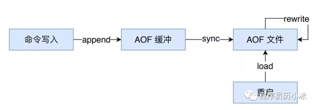 如上图所示,AOF 持久化功能的实现可以分为命令追加( append )、文件写入( write )、文件同步( sync )、文件重写(rewrite)和重启加载(load)。其流程如下: