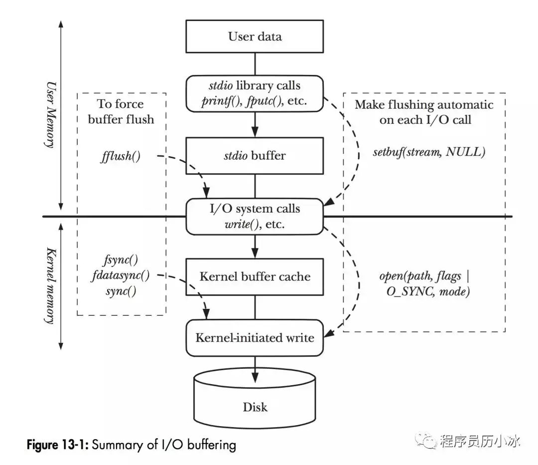 write 操作在写入系统缓冲区之后直接返回。同步硬盘操作依赖于系统调度机制,例如:缓冲区页空间写满或者达到特定时间周期。同步文件之前,如果此时系统故障宕机,缓冲区内数据将丢失。