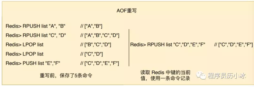 如上图所示,重写前要记录名为 list的键的状态,AOF 文件要保存五条命令,而重写后,则只需要保存一条命令。