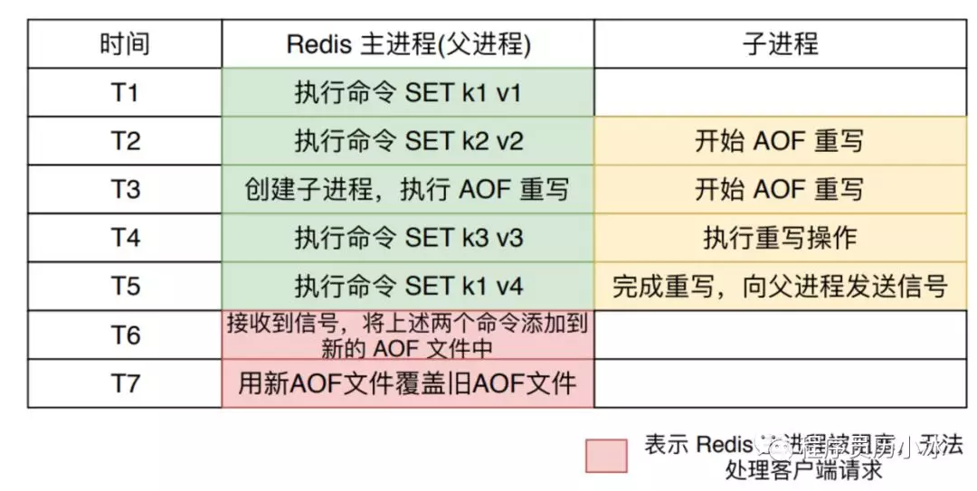 在整个 AOF 后台重写过程中,只有信号处理函数执行时会对 Redis 主进程造成阻塞,在其他时候,AOF 后台重写都不会阻塞主进程。