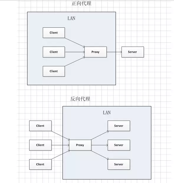 在正向代理中,Proxy和Client同属于一个LAN(图中方框内),隐藏了客户端信息;