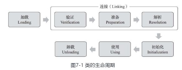 一个类型从被加载到虚拟机内存中开始,到卸载出内存为止,它的整个生命周期将会经历加载(Loading)、验证(Verification)、准备(Preparation)、解析(Resolution)、初始化(Initialization)、使用(Using)和卸载(Unloading)七个阶段,其中验证、准备、解析三个部分统称为连接(Linking)。这七个阶段的发生顺序如图7-1所示。