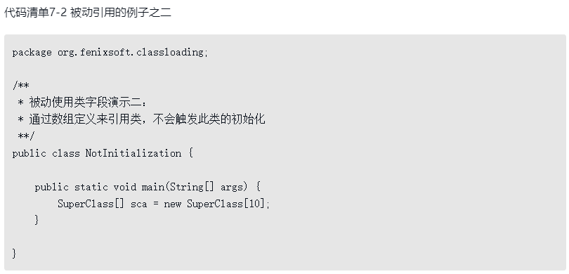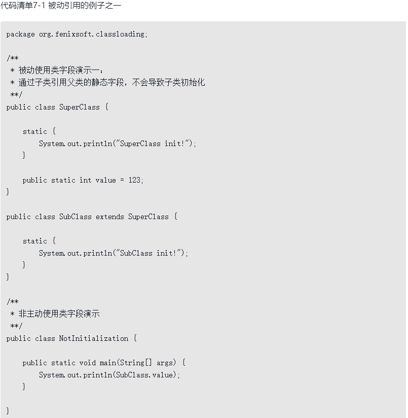 对于这六种会触发类型进行初始化的场景,《Java虚拟机规范》中使用了一个非常强烈的限定语——“有且只有”,这六种场景中的行为称为对一个类型进行主动引用。除此之外,所有引用类型的方式都不会触发初始化,称为被动引用。下面举三个例子来说明何为被动引用,分别见代码清单7-1、代码清单7-2和代码清单7-3。
