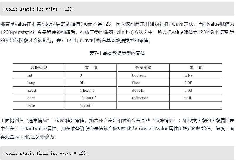 编译时Javac将会为value生成ConstantValue属性,在准备阶段虚拟机就会根据Con-stantValue的设置将value赋值为123。