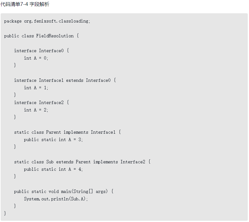 以上解析规则能够确保Java虚拟机获得字段唯一的解析结果,但在实际情况中,Javac编译器往往会采取比上述规范更加严格一些的约束,譬如有一个同名字段同时出现在某个类的接口和父类当中,或者同时在自己或父类的多个接口中出现,按照解析规则仍是可以确定唯一的访问字段,但Javac编译器就可能直接拒绝其编译为Class文件。在代码清单7-4中演示了这种情况,如果注释了Sub类中的“public static int A=4;”,接口与父类同时存在字段A,那Oracle公司实现的Javac编译器将提示“The field Sub.A is ambiguous”,并且会拒绝编译这段代码。