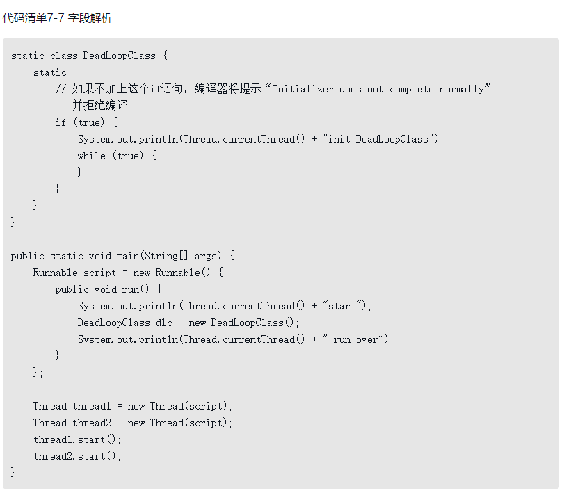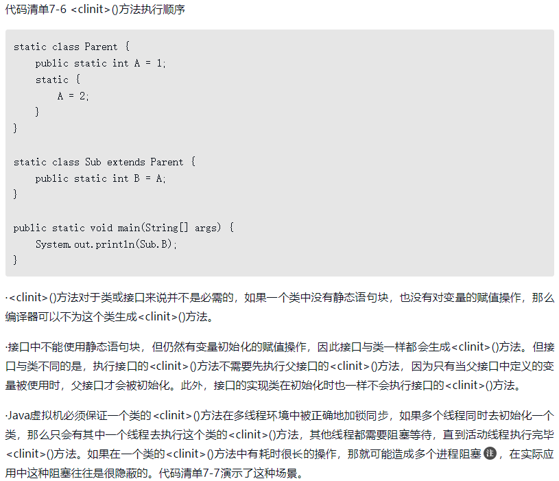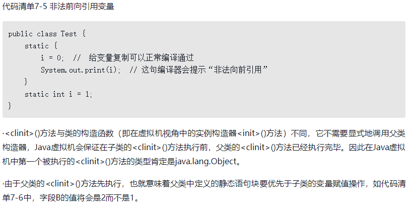 ·<clinit>()方法是由编译器自动收集类中的所有类变量的赋值动作和静态语句块(static{}块)中的语句合并产生的,编译器收集的顺序是由语句在源文件中出现的顺序决定的,静态语句块中只能访问到定义在静态语句块之前的变量,定义在它之后的变量,在前面的静态语句块可以赋值,但是不能访问,如代码清单7-5所示。