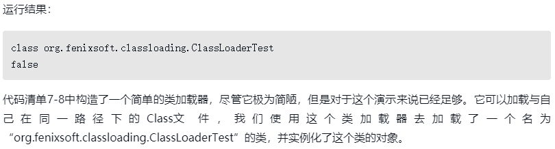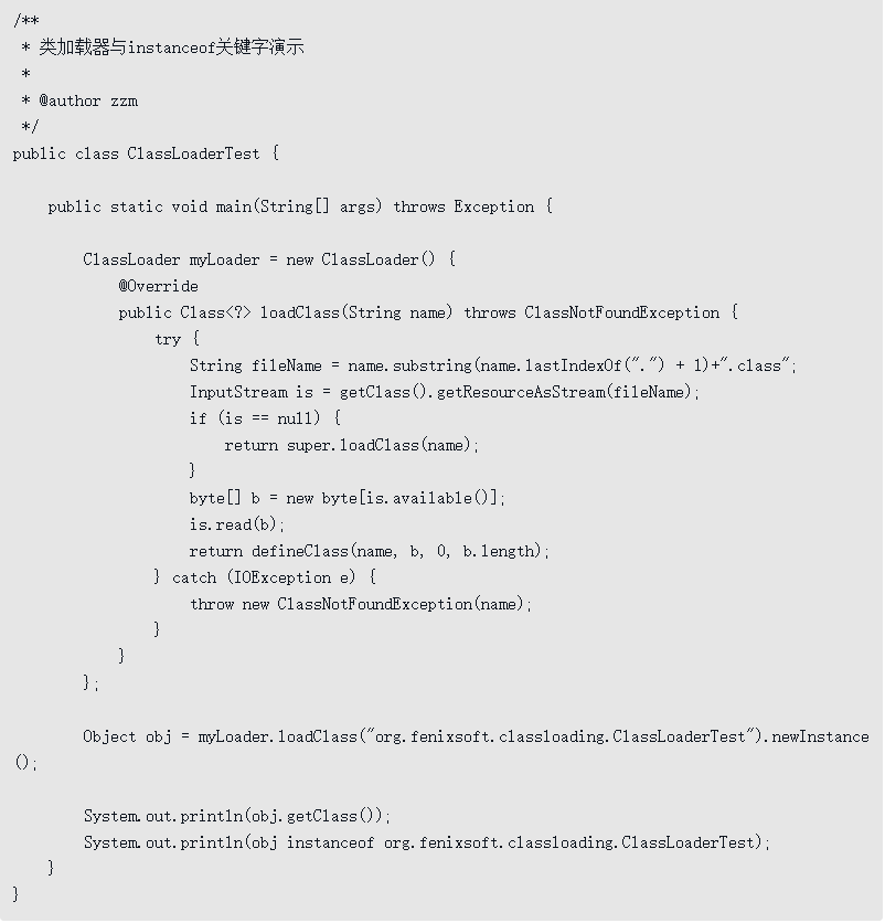 两行输出结果中,从第一行可以看到这个对象确实是类org.fenixsoft.classloading.ClassLoaderTest实例化出来的,但在第二行的输出中却发现这个对象与类org.fenixsoft.classloading.ClassLoaderTest做所属类型检查的时候返回了false。这是因为Java虚拟机中同时存在了两个ClassLoaderTest类,一个是由虚拟机的应用程序类加载器所加载的,另外一个是由我们自定义的类加载器加载的,虽然它们都来自同一个Class文件,但在Java虚拟机中仍然是两个互相独立的类,做对象所属类型检查时的结果自然为false。