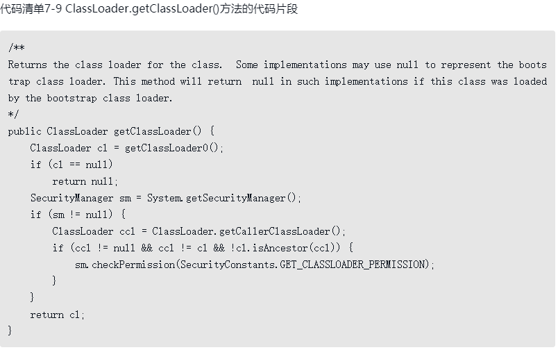 ·启动类加载器(Bootstrap Class Loader):前面已经介绍过,这个类加载器负责加载存放在<JAVA_HOME>\lib目录,或者被-Xbootclasspath参数所指定的路径中存放的,而且是Java虚拟机能够识别的(按照文件名识别,如rt.jar、tools.jar,名字不符合的类库即使放在lib目录中也不会被加载)类库加载到虚拟机的内存中。启动类加载器无法被Java程序直接引用,用户在编写自定义类加载器时,如果需要把加载请求委派给引导类加载器去处理,那直接使用null代替即可,代码清单7-9展示的就是java.lang.ClassLoader.getClassLoader()方法的代码片段,其中的注释和代码实现都明确地说明了以null值来代表引导类加载器的约定规则。