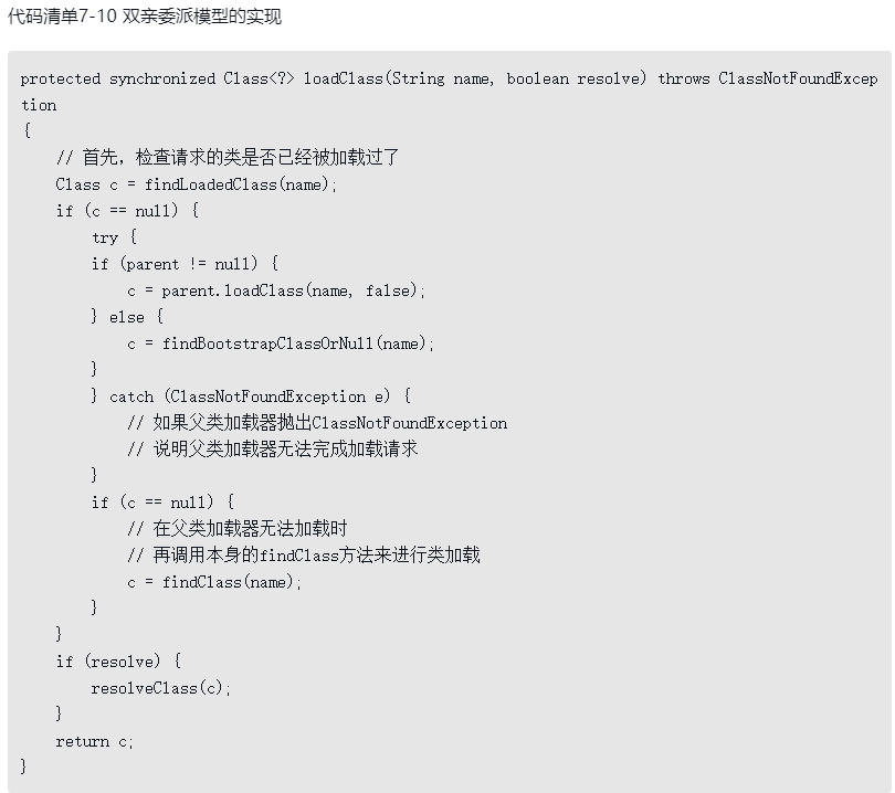 双亲委派模型对于保证Java程序的稳定运作极为重要,但它的实现却异常简单,用以实现双亲委派的代码只有短短十余行,全部集中在java.lang.ClassLoader的loadClass()方法之中,如代码清单7-10所示。