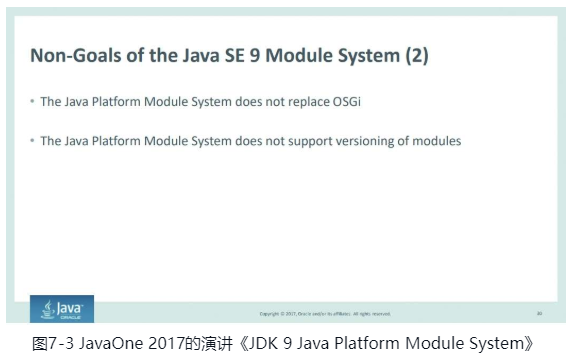 在JDK 9时加入Class文件格式的Module属性,里面有module_version_index这样的字段,用户可以在编译时使用“javac--module-version”来指定模块版本,在Java类库API中也存在java.lang.module.ModuleDescriptor.Version这样的接口可以在运行时获取到模块的版本号。这一切迹象都证明了Java模块化系统对版本号的支持本可以不局限在编译期。而官方却在Jigsaw的规范文件、JavaOne大会的宣讲和与专家的讨论列表中,都反复强调“JPMS的目的不是代替OSGi”,“JPMS不支持模块版本”这样的话语,如图7-3所示。