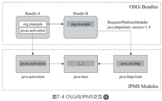 Oracle给出的理由是希望维持一个足够简单的模块化系统,避免技术过于复杂。但结合JCP执行委员会关于的Jigsaw投票中Oracle与IBM、RedHat的激烈冲突[插图],实在很难让人信服这种设计只是单纯地基于技术原因,而不是厂家之间互相博弈妥协的结果。Jigsaw仿佛在刻意地给OSGi让出一块生存空间,以换取IBM支持或者说不去反对Jigsaw,其代价就是几乎宣告Java模块化系统不可能拥有像OSGi那样支持多版本模块并存、支持运行时热替换、热部署模块的能力,可这却往往是一个应用进行模块化的最大驱动力所在。如果要在JDK 9之后实现这种目的,就只能将OSGi和JPMS混合使用,如图7-4所示,这无疑带来了更高的复杂度。模块的运行时部署、替换能力没有内置在Java模块化系统和Java虚拟机之中,仍然必须通过类加载器去实现,实在不得不说是一个缺憾。