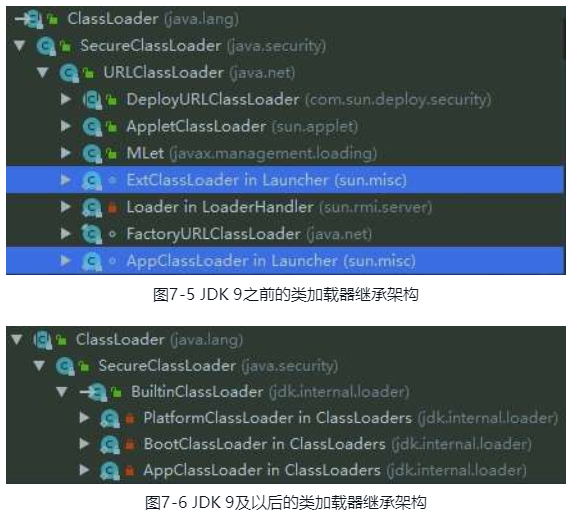 其次,平台类加载器和应用程序类加载器都不再派生自java.net.URLClassLoader,如果有程序直接依赖了这种继承关系,或者依赖了URLClassLoader类的特定方法,那代码很可能会在JDK 9及更高版本的JDK中崩溃。现在启动类加载器、平台类加载器、应用程序类加载器全都继承于jdk.internal.loader.BuiltinClassLoader,在BuiltinClassLoader中实现了新的模块化架构下类如何从模块中加载的逻辑,以及模块中资源可访问性的处理。两者的前后变化如图7-5和7-6所示。