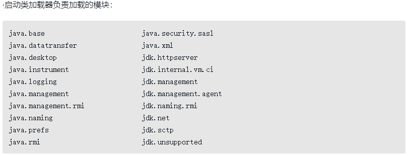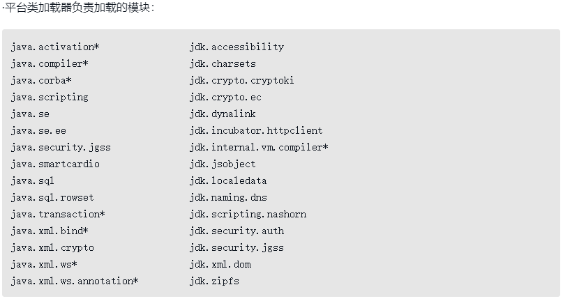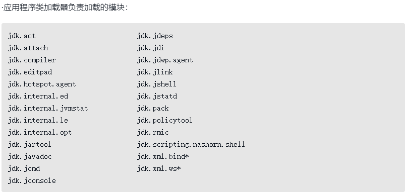 在Java模块化系统明确规定了三个类加载器负责各自加载的模块,即前面所说的归属关系,如下所示。