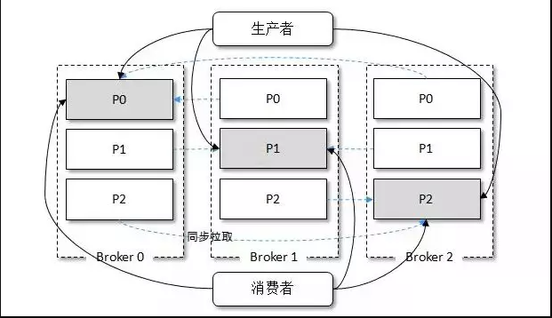 在 Kafka 集群中有 3 个分区,每个分区有 3 个副本,正好均匀地分布在 3个 broker 上,灰色阴影的代表 leader 副本,非灰色阴影的代表 follower 副本,虚线表示 follower 副本从 leader 副本上拉取消息。当生产者写入消息的时候都写入 leader 副本,对于上图中的情形,每个 broker 都有消息从生产者流入;当消费者读取消息的时候也是从 leader 副本中读取 的,对于图 8-23 中的情形,每个 broker 都有消息流出到消费者。