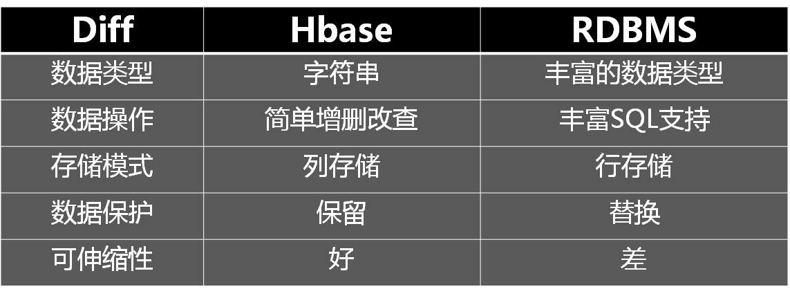 下图是针对Hbase和关系型数据库的基本的一个比较:
