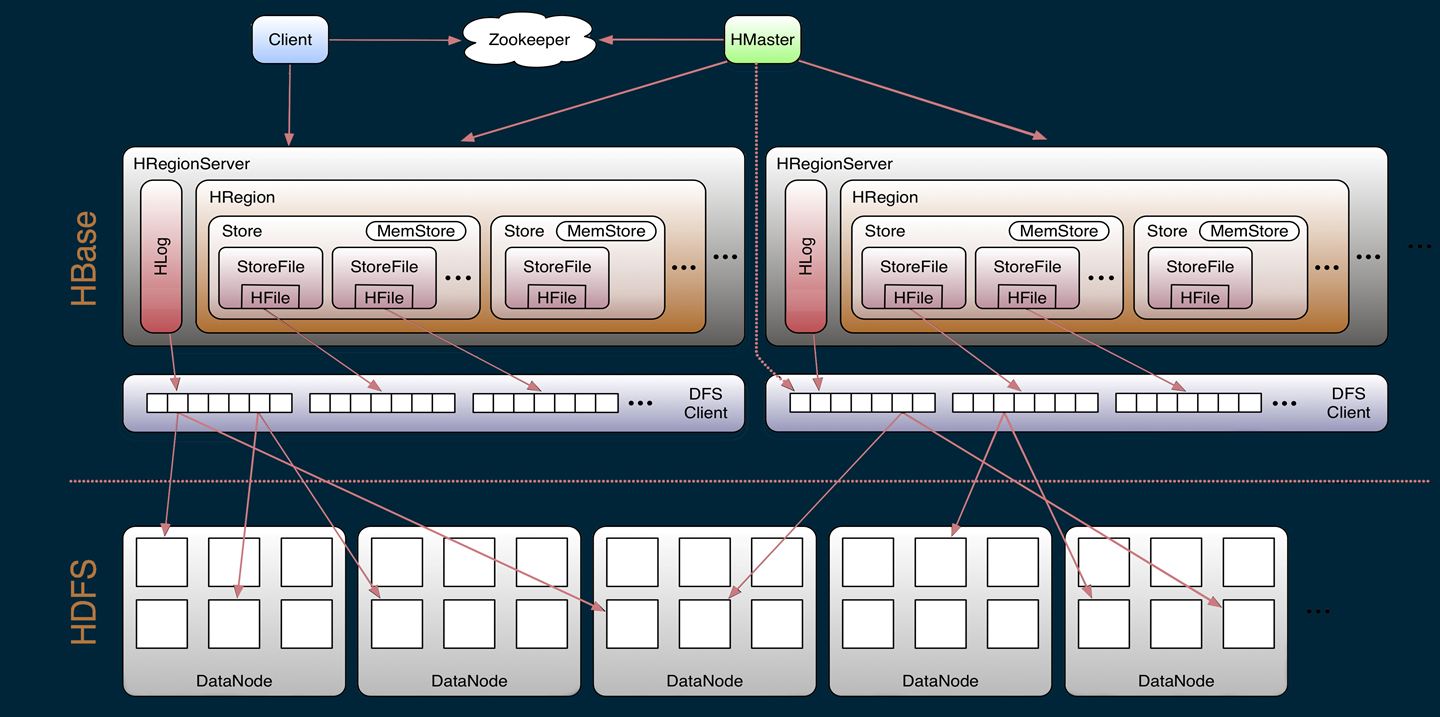 备注:RegionServer的作用是管理region、承接业务的访问,这个后面会详细的介绍通过横向添加Datanode的机器,进行存储层扩容,提升Hbase的数据存储能力和提升后端存储的读写能力。