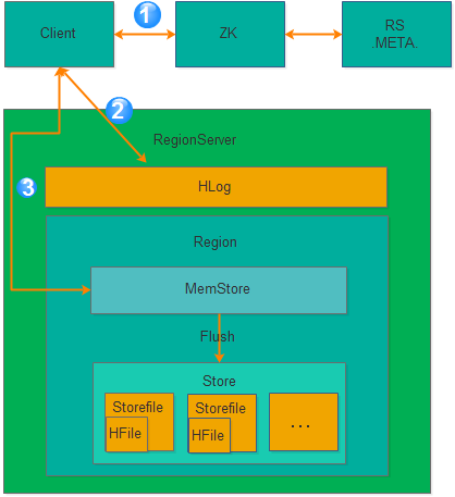 region1和region2被master分配给了RegionServer1(RS1),Region3被master配分给了RegionServer2(RS2)