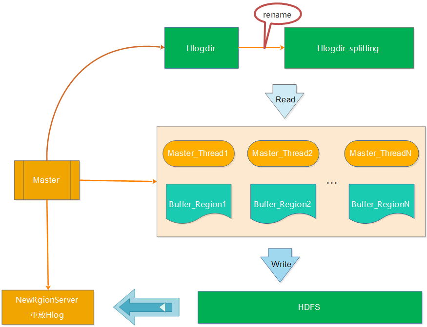 在最开始的恢复流程中,Hlog的整个切分过程都由于Master来执行,如下图所示: