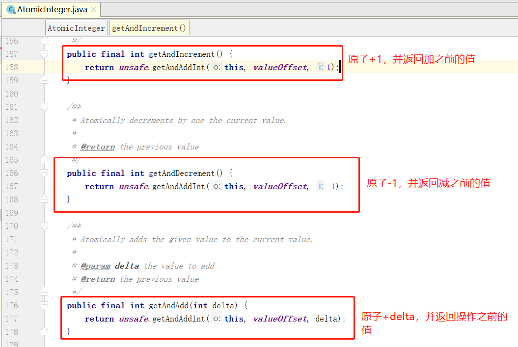 CAS在java.util.concurrent.atomic相关类、Java AQS、JUC中并发集合等实现上有非常广泛的应用,我们看一下java.util.concurrent.atomic.AtomicInteger类,这个类可以在多线程环境中对int类型的数据执行高效的原子修改操作,并保证数据的正确性,看一下此类中用到Unsafe cas的地方:
