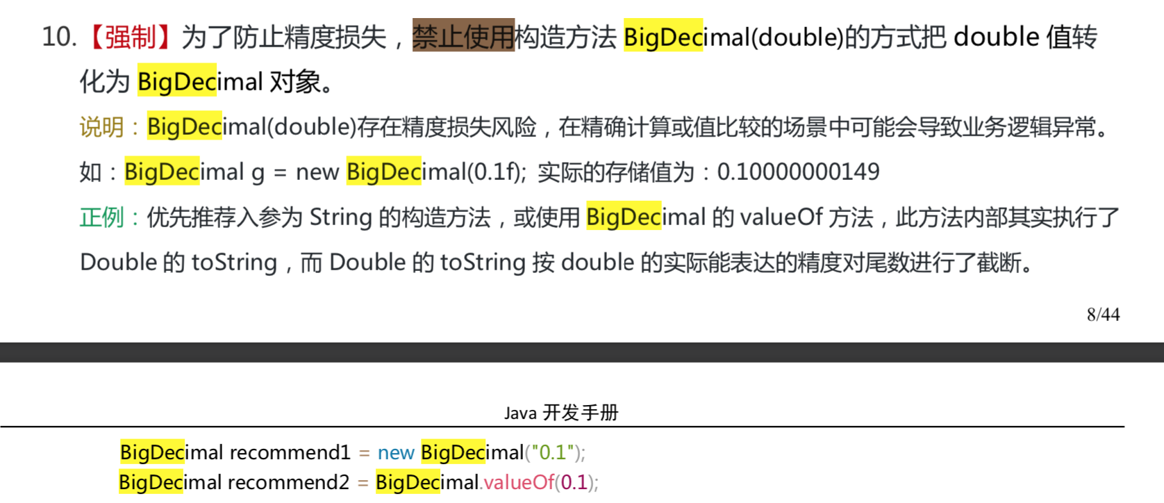 注意:我们在使用BigDecimal时,为了防止精度丢失,推荐使用它的 BigDecimal(String) 构造方法来创建对象。《阿里巴巴Java开发手册》对这部分内容也有提到如下图所示。