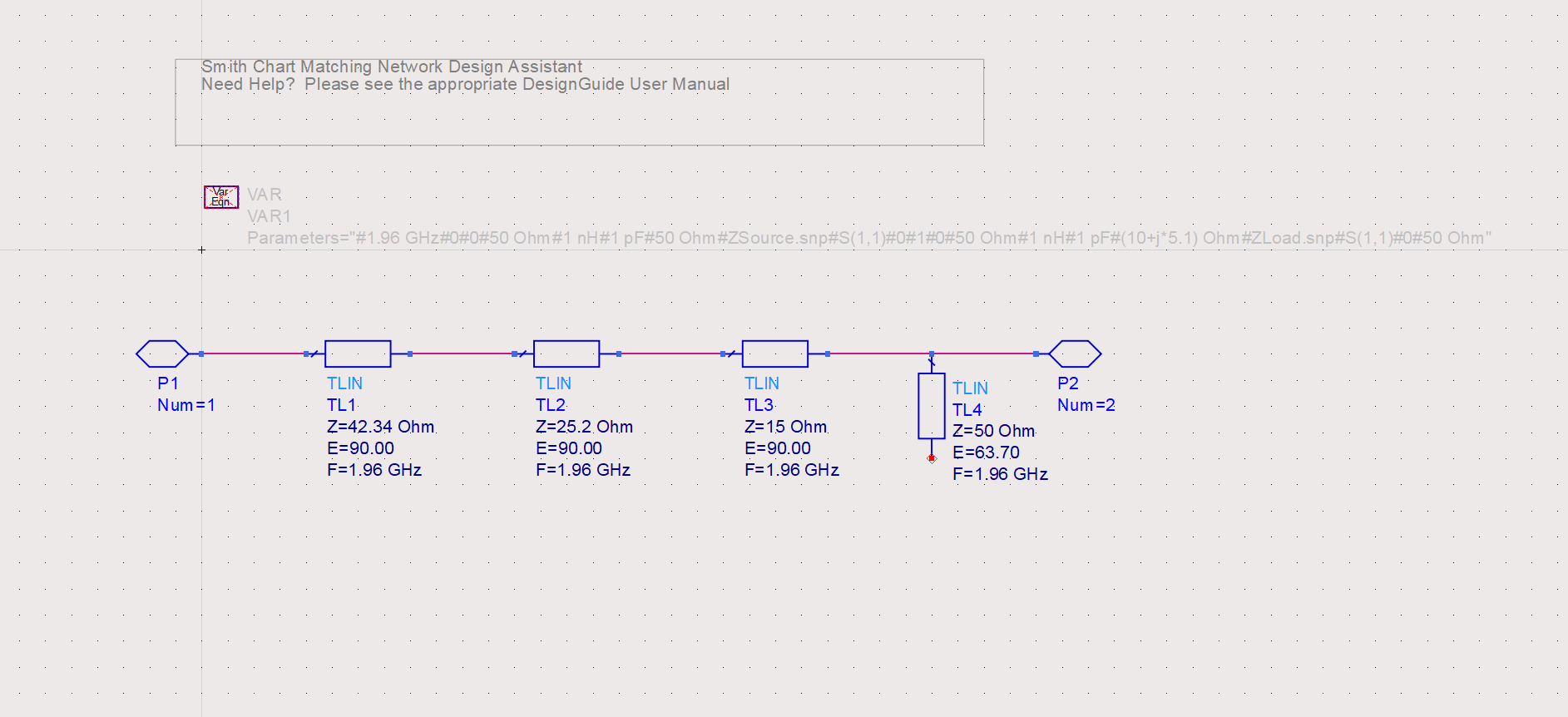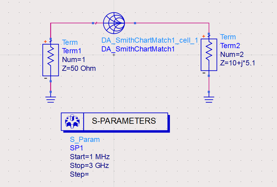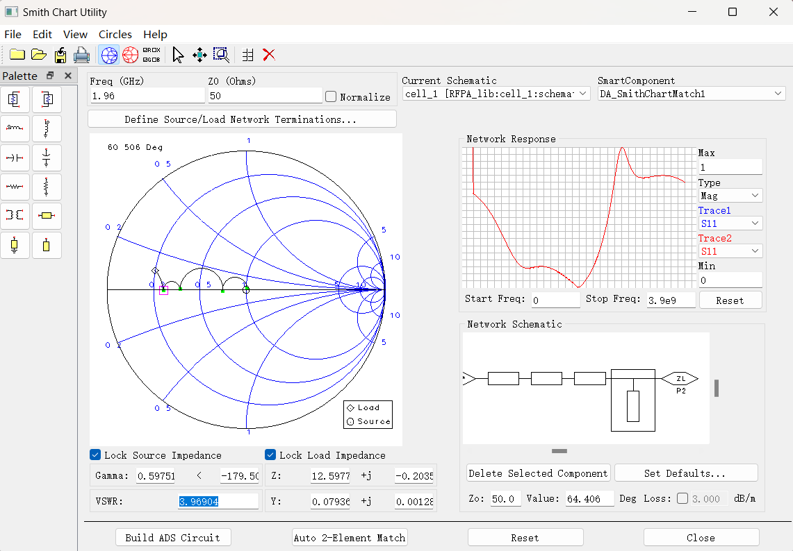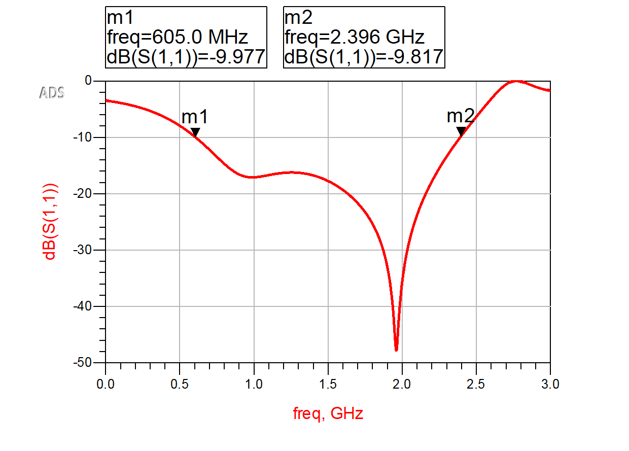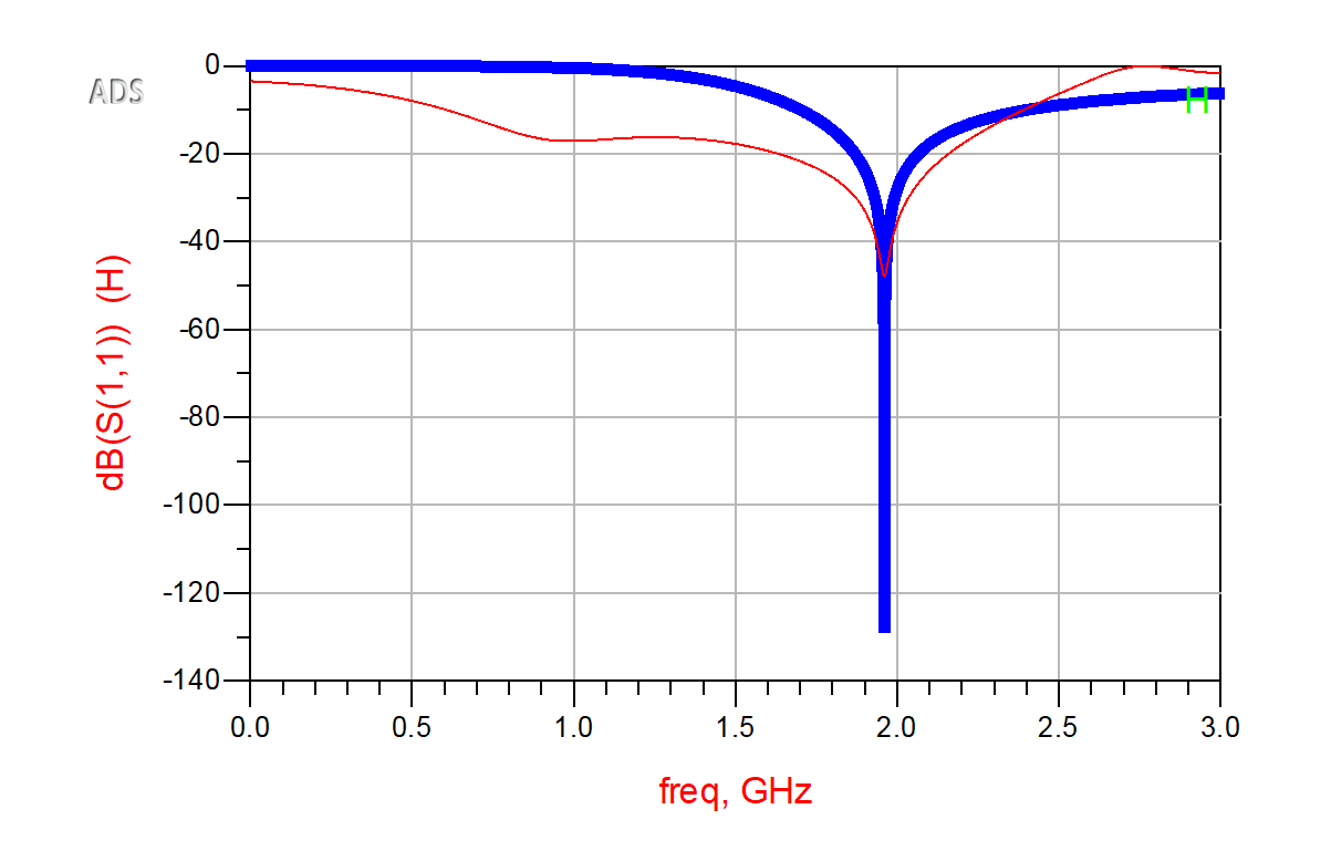 作为对比,使用ADS自动生成了电容电感匹配网络,其中蓝色为自动生成的匹配网络。