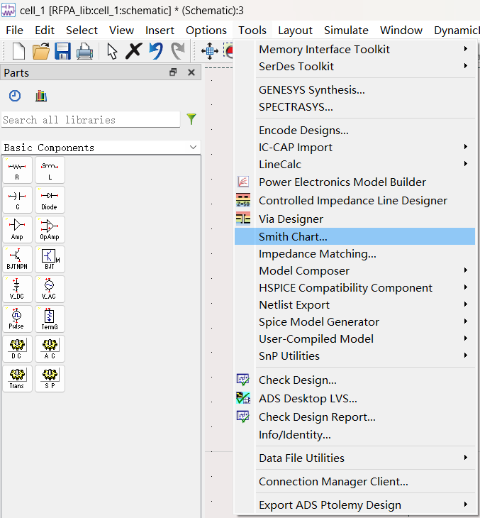 3.工具栏Tool->Smith Chat打开Smith阻抗匹配工具