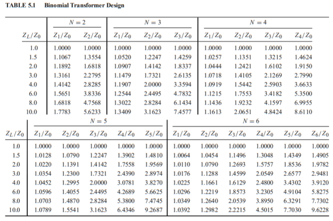 理论上我们可以根据巴特沃斯函数做出无数节阻抗变换器,但是这样也意味着体积的无限扩大,射频设计是一个多方面因素平衡的结果,一般情况下,3-5节也就够工程应用了,抛开复杂的计算,我们可以通过查表来快速完成。