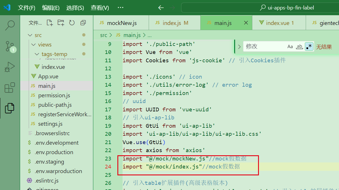 123456789101112在main.js中设置process.env.MOCK && require("./mock/index.js")。process.env.MOCK这句就是判断刚才设置的值,如果是true,才会执行语句引入mock,如果是false,则后面的语句不执行,即不引入mock。