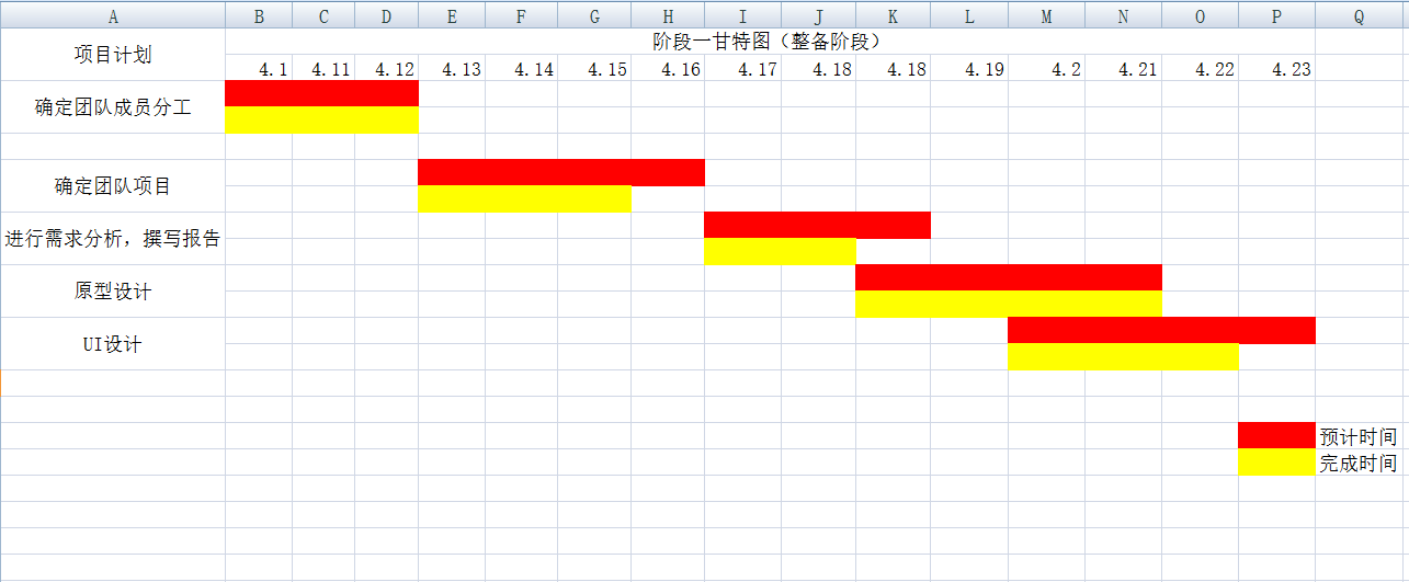 根据甘特图表示,我们团队第一阶段时间是4月10号开始到4月23结束。在第一阶段主要任务有:确定团队成员分工,确定团队项目,进行需求分析,撰写报告,原型设计,UI设计。并且队员都在规定时间内很好完成自己的任务。由此可以看出我们团队已经拥有了凝聚力,在以后做项目任务能够更好的完成。