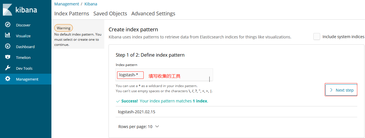 ~~~ 输入logstash-*, 点击"Next step"