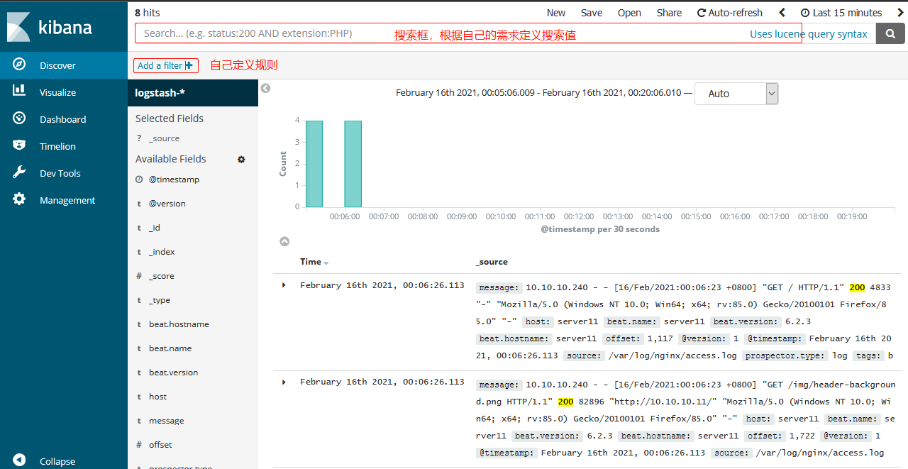 ### --- 点击:Discover——>Index pattern:logstash-*