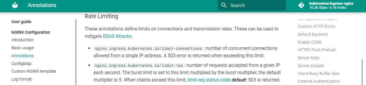 nginx.ingress.kubernetes.io/limit-connections: // 单个 IP 地址允许的并发连接数。超过此限制时将返回 503 错误。