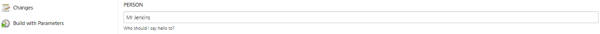 string(name: 'PERSON', defaultValue: 'Mr Jenkins', description: 'Who should I say hello to?')